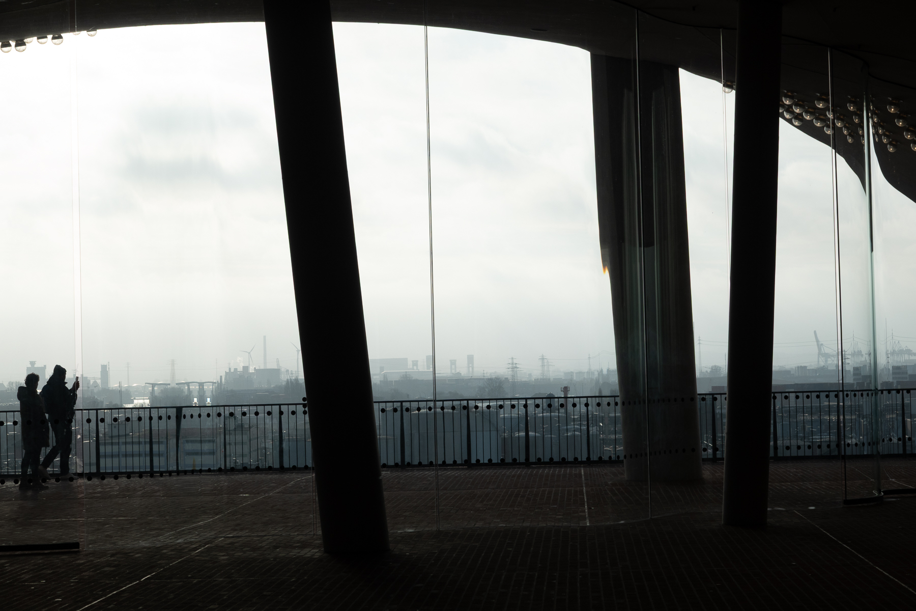Für den zweiten Tag in Hamburg hatten wir eine Führung in der Elphi gebucht. Die Elbphilarmonie ist schon ein beeindruckendes Gebäude, dass auf einem noch nicht so alten, aber durch die Containerschiffe nicht mehr nutzbaren Speicher errichtet wurde. Den Speicher erkennt man an seinen roten Backsteinziegeln, dem damals üblichen Baumaterial in der Speicherstadt. Der Aufbau, ursprünglich in leichter Bauweise geplant, sollte schließlich komplett in Glas eingefasst werden, was ein erhebliches Mehr an Gewicht bedeutete. Damit das Gesamtgewicht der Konstruktion aus Speicher und Aufbau überhaupt getragen werden konnte, mussten die 1111 Betonpfähle des Speichers um 621 zusätzliche Stützpfeiler ergänzt werden, die es in das Hafenbecken zu rammen galt. Dies und die spezielle Verglasung waren nicht die einzigen kostentreibenden Posten.