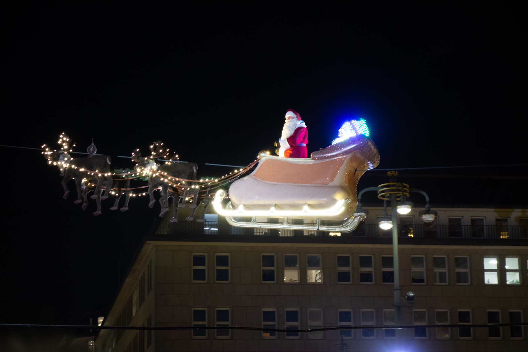 Wenn man das Schauspiel aus einiger Entfernung beobachtet, ist das Seil, an dem der Schlitten mitsamt Weihnachtsmann Richtung riesiger Tanne in den Himmel gleitet, in der Dunkelheit nicht zu erkennen. Dann sieht der Act wirklich verblüffend echt aus. Eine tolle Idee, umgesetzt vom Hochseilartisten Rambo Bügler, der im feuerfesten Kostüm im Schlitten sitzt.