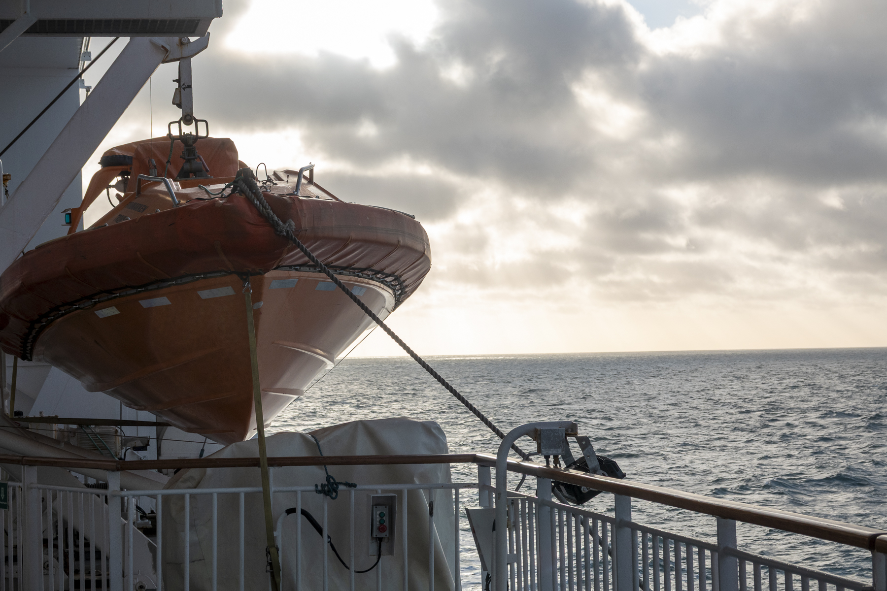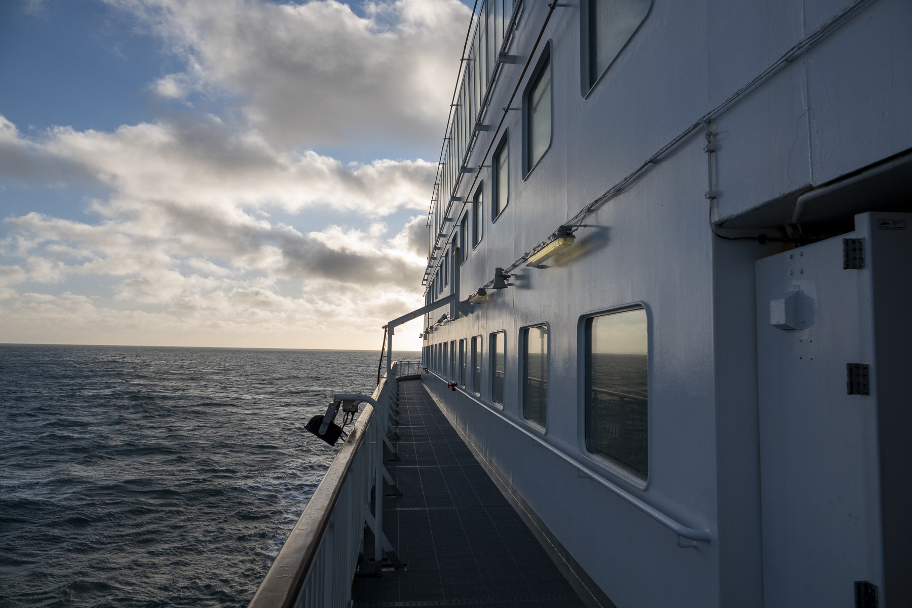 Die Nacht verlief ausgesprochen ruhig, da wir noch lange Zeit auf der Elbe unterwegs waren und auch die Nordsee sich von der eher milden Seite zeigte. Der Wind und die Wellen kamen von hinten und die Wellen waren laut Aussage der Schiffsführung gut einen Meter hoch. Entsprechen rollte das Schiff ein wenig über seine Querachse, was ich beim Frühstück an den Panoramascheiben im Heck gut beobachten konnte.