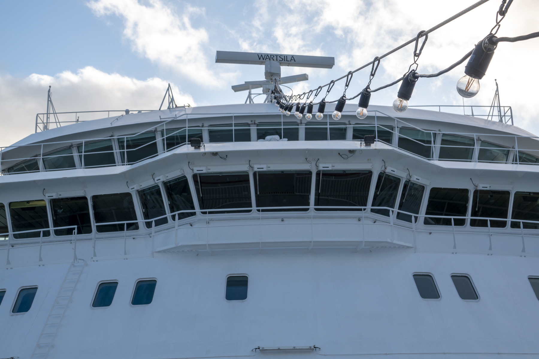 Und so sitze ich nun hier in einem schaukelnden Schiff und lausche dem Knarzen und Ächtzen, dem Rollen und Klimpern der diversesten Gegenstände, während ich diesen Bericht schreibe. Mit einem kleinen schmunzeln denke ich an meinen Weg von der Bar zurück zur Kabine. Ein Schlingern und Eiern war das, ein Stolpern und Tappeln, dass es den Zuschauern zum Lachen gereichte. Das Gehen bei derartigem Seegang fällt einer Landratte wie mir derzeit echt schwer. Aber noch zwei drei weiterer solcher Tage und auch das dürfte wieder funktioneren. Nur meine Liebste wäre ich bestimmt los. Zumindest würde sie in einen Generalstreik treten, wo ich doch behauptet hatte, diese Tour an Norwegens Küste entlang wäre wie Bus fahren. Da bin ich froh, dass wir gegen acht Uhr am kommenden Morgen in Stavager einlaufen und das Schiff mitten in der Stadt parkt. Dann ist erst mal Schluss mit der Wackelei und ich kann die MS Finnmarken endlich von außen auf ein oder mehrere Fotos bannen.