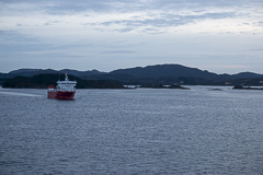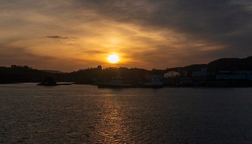 Heute morgen war ich schon vor dem Wecker wach, was dazu führte, dass wir schon vor dem Anlegen in Rørvik beim Frühstück saßen. Draußen war es um neun Uhr immer noch dunkel. Man merkt deutlich, dass wir weit im Norden sind. Das Anlegemanöver fand während des Frühstücks statt und am Horizont hinter den Bergen war erkennbar, dass die Sonne aufzugehen gedachte.