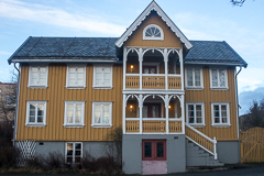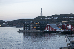 Nach dem Frühstück habe ich dann erst einmal ein paar Bilder vom Schiff in Richtung Sonnenaufgang und Hafen gemacht. Danach haben wir uns äußerst gemütlich auf den Landgang vorbereitet. Die feilgebotenen Ausflüge verhießen nichts weltbewegendes, darum war unsere Erwartungshaltung an Rørvik auch nicht sonderlich hoch. Und wir wurden nicht enttäuscht. Ein paar typisch norwegische Holzhäuser, ein Küstenmuseum in einem schrecklichen Betonbau, dass sich zur Anlegestelle hin durch geschwunge Metallflächen als eine Art Eismeerkathedrale tarnte und ein Schiffsrestaurator, der alte Holzboote wieder auf Vordermann brachte. Letzteren habe ich aus Respekt nicht mit der Jagd nach Fotos belästigt, weshalb es von diesen sicherlich noch interessantesten Motiven keine Bilder gibt. Nach gut einer Stunde Rundgang waren wir der Meinung, alles wesentliche gesehen zu haben und begaben uns wiedr aufs Schiff. Hier haben wir es uns auf Deck vier in den Sesseln an den Panoramascheiben gemütlich gemacht und erst einmal in Ruhe einen Kaffee getrunken.