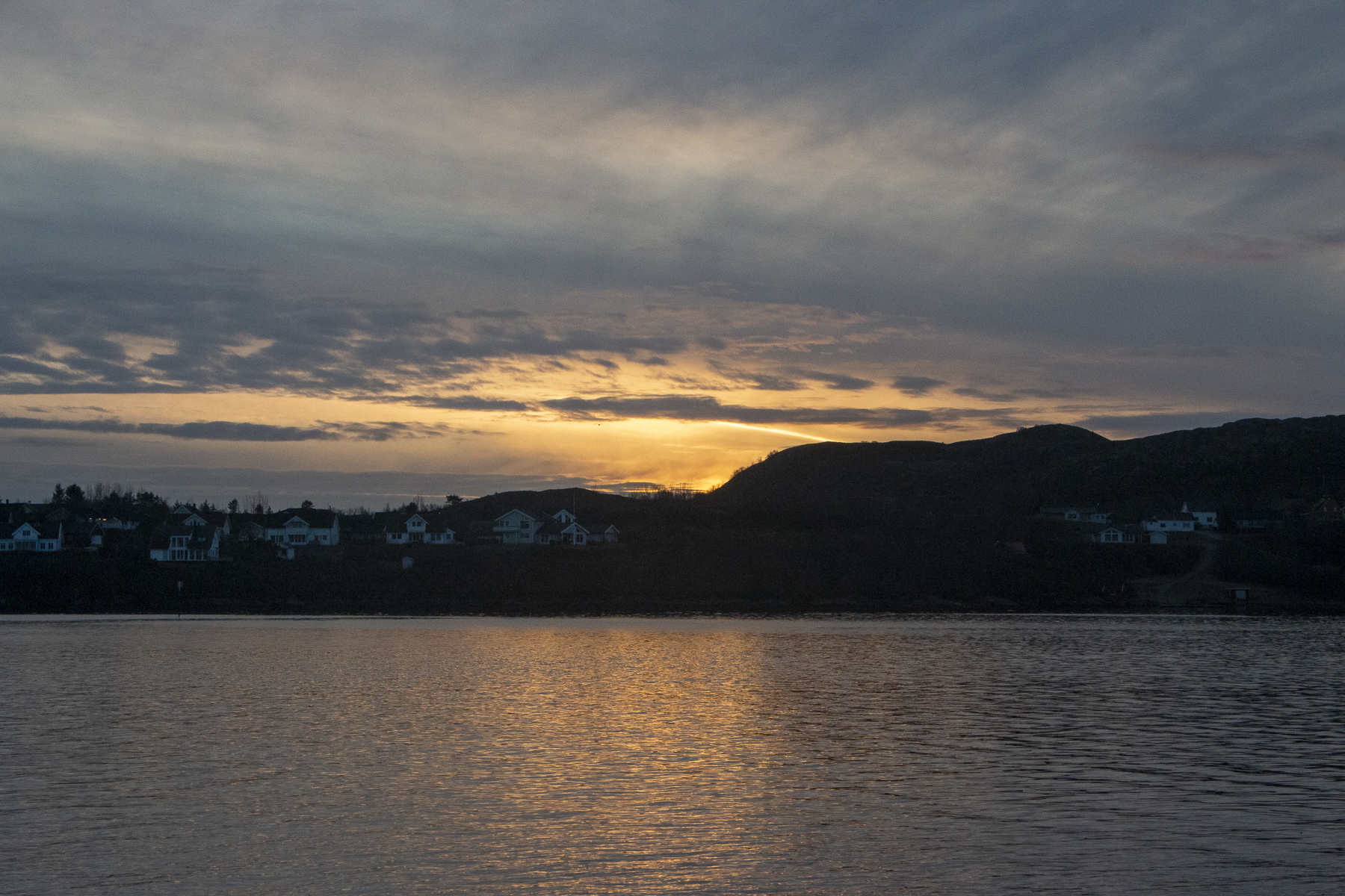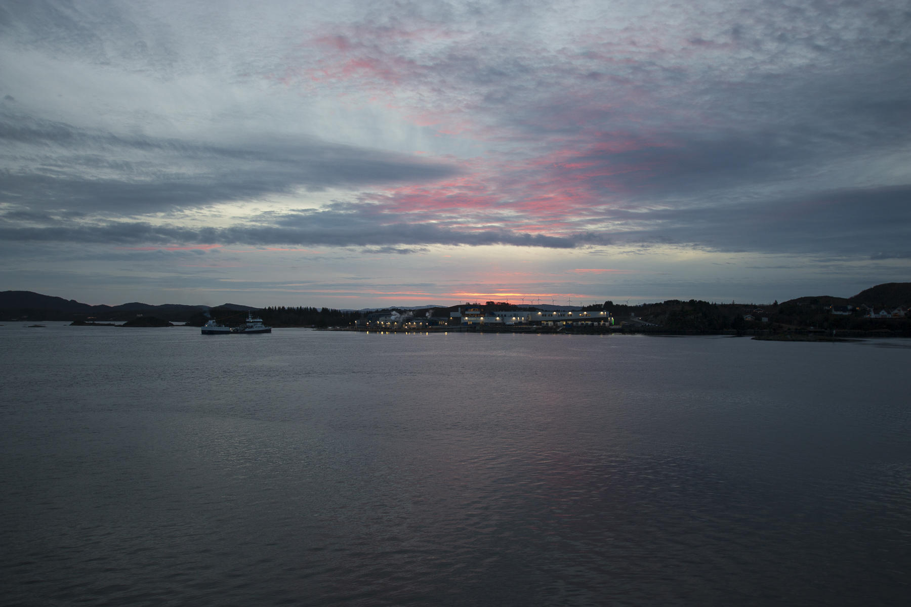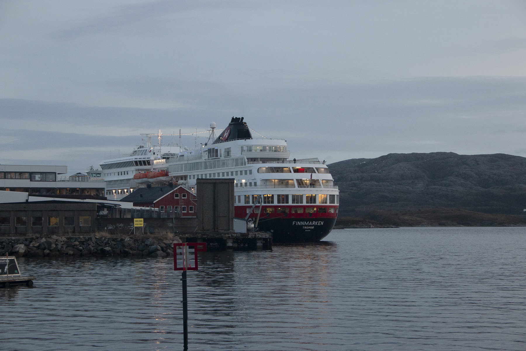 Heute morgen war ich schon vor dem Wecker wach, was dazu führte, dass wir schon vor dem Anlegen in Rørvik beim Frühstück saßen. Draußen war es um neun Uhr immer noch dunkel. Man merkt deutlich, dass wir weit im Norden sind. Das Anlegemanöver fand während des Frühstücks statt und am Horizont hinter den Bergen war erkennbar, dass die Sonne aufzugehen gedachte.
