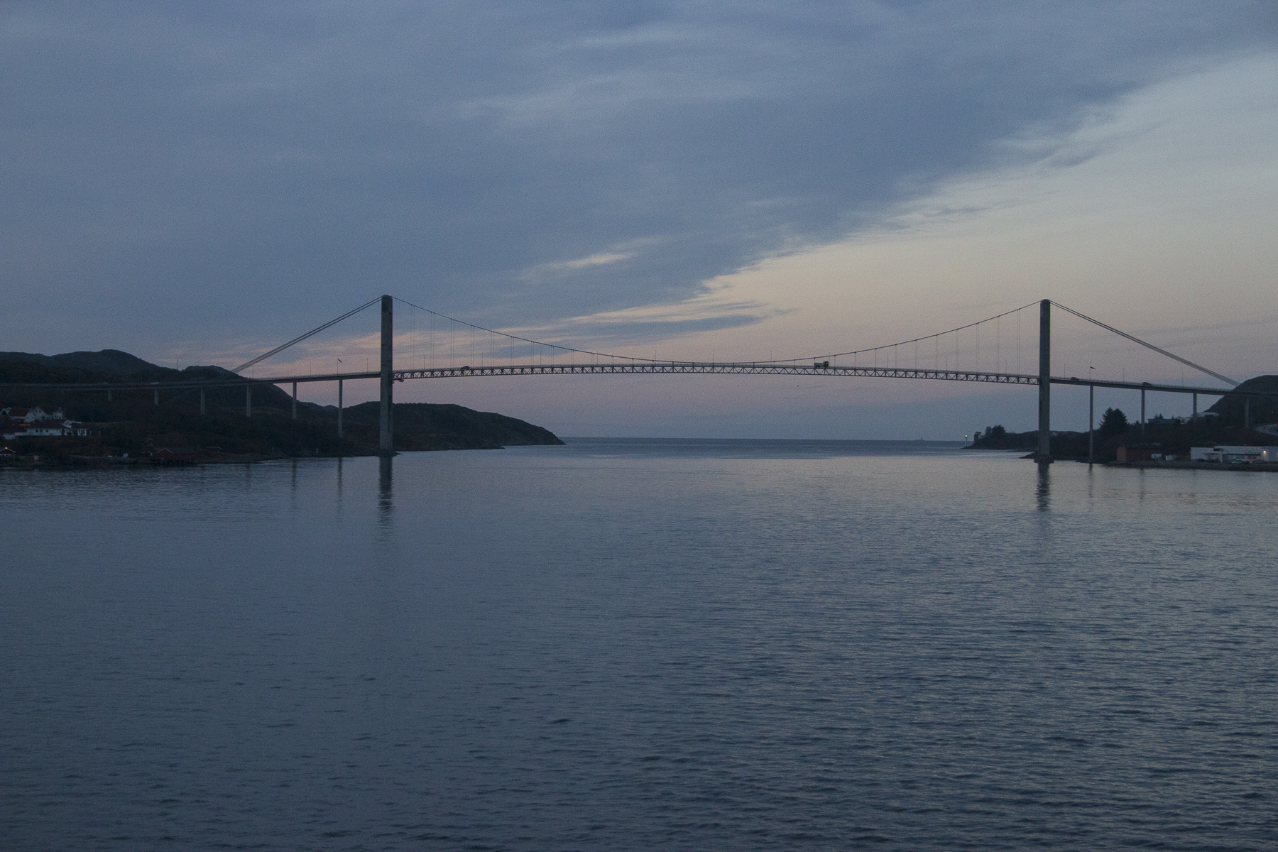 Am späteren Abend dann haben wir den Polarkreis überquert. Als wir nach der Durchsage endlich raus kamen, war die Kugel schon mittschiffs und ich hatte Probleme, die neue Kamera schnell schussfertig zu bekommen. Für ein Foto von der von einem Scheinwerfer angeleuchteten Kugel hat es nicht gereicht. Als ich endlich so weit war, wurde der Scheinwerfer abgeschaltet und die Finsternis nahm wieder den gesamten Raum ein. Vielleicht habe ich auf der Rückfahrt ja mehr Glück. Zumindest nutze ich dann wieder die gewohnten Kameras und Objektive.