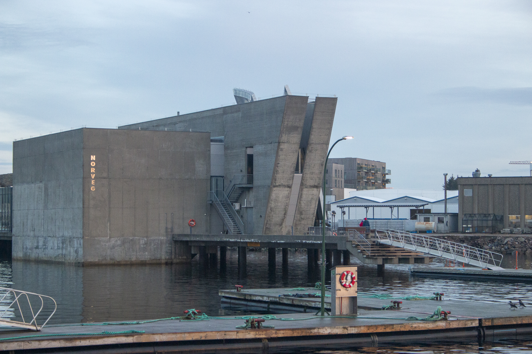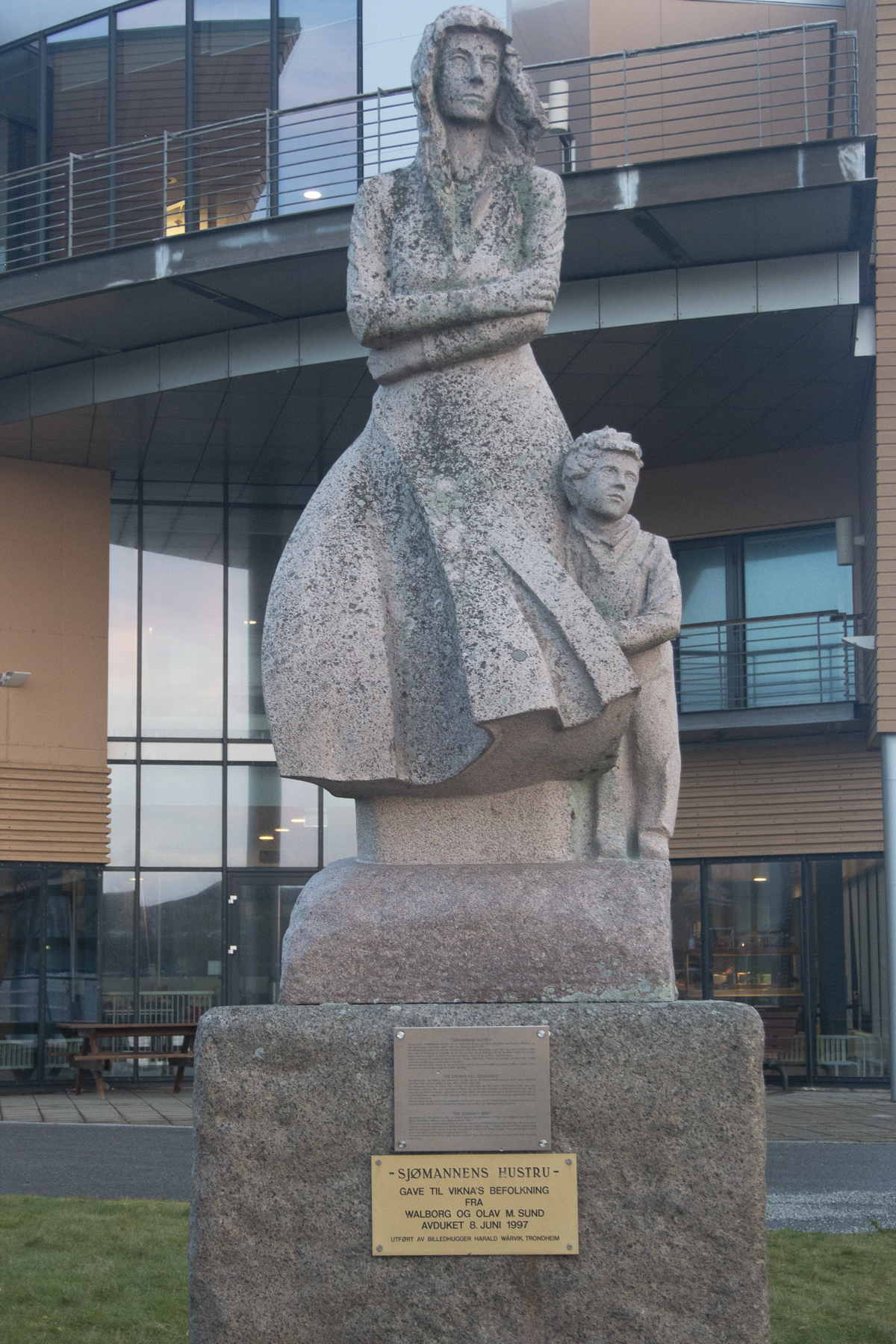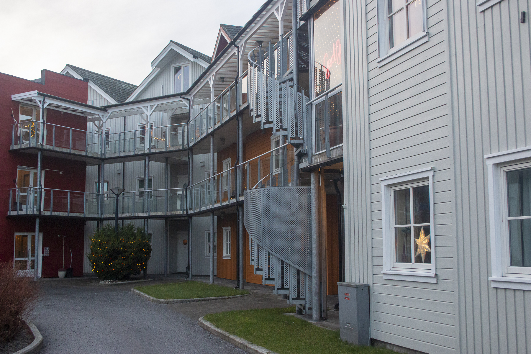 Nach dem Frühstück habe ich dann erst einmal ein paar Bilder vom Schiff in Richtung Sonnenaufgang und Hafen gemacht. Danach haben wir uns äußerst gemütlich auf den Landgang vorbereitet. Die feilgebotenen Ausflüge verhießen nichts weltbewegendes, darum war unsere Erwartungshaltung an Rørvik auch nicht sonderlich hoch. Und wir wurden nicht enttäuscht. Ein paar typisch norwegische Holzhäuser, ein Küstenmuseum in einem schrecklichen Betonbau, dass sich zur Anlegestelle hin durch geschwunge Metallflächen als eine Art Eismeerkathedrale tarnte und ein Schiffsrestaurator, der alte Holzboote wieder auf Vordermann brachte. Letzteren habe ich aus Respekt nicht mit der Jagd nach Fotos belästigt, weshalb es von diesen sicherlich noch interessantesten Motiven keine Bilder gibt. Nach gut einer Stunde Rundgang waren wir der Meinung, alles wesentliche gesehen zu haben und begaben uns wiedr aufs Schiff. Hier haben wir es uns auf Deck vier in den Sesseln an den Panoramascheiben gemütlich gemacht und erst einmal in Ruhe einen Kaffee getrunken.