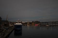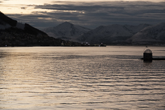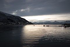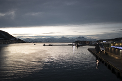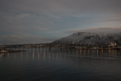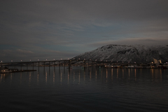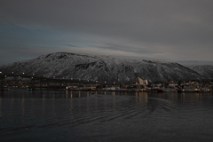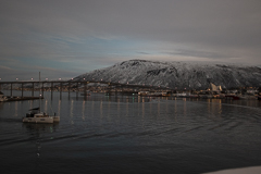 Pünktlich zum Frühstück legten wir in Tromsø, dem Tor zur Arktis, an. Im Blick wieder die Brücke, an deren Ende die Eismeerkathedrale thront. Das Wetter war uns heute besonders gewogen. Kein Schnee, kein Regen und kein Wind. Selbst die Wolken hatten ein Einsehen und ließen etliche Teile des Himmels frei. So wurden wir einer wünderschönen Lichtstimmung ansichtig, wie sie nur in der Polarnacht oder vor einem Sonnenaufgang entsteht und von den Norwegern so geliebt wird.