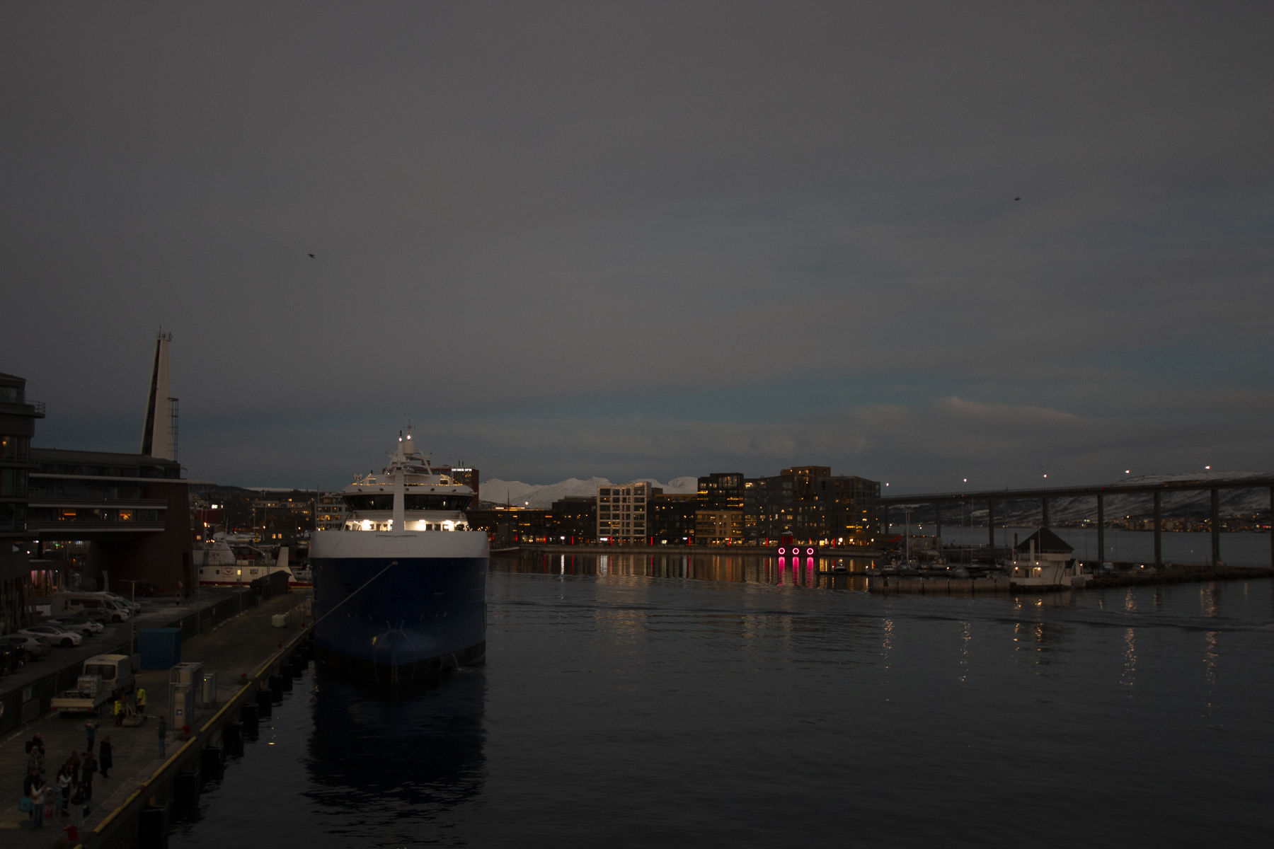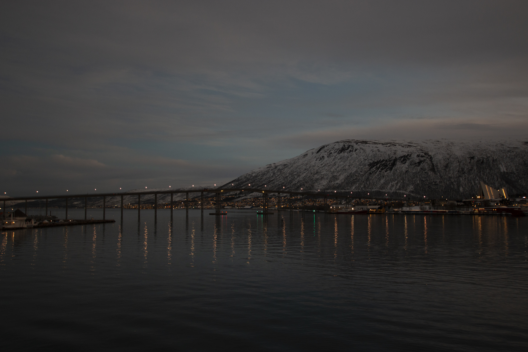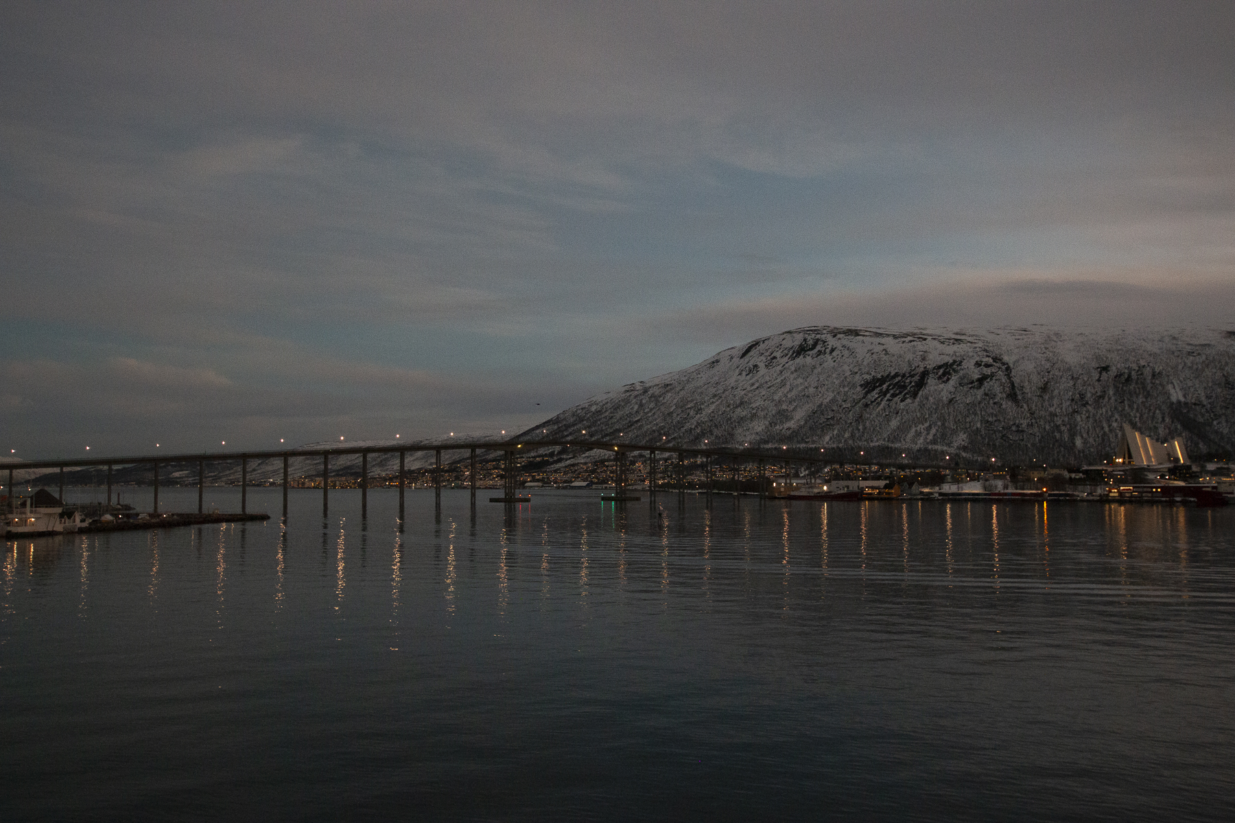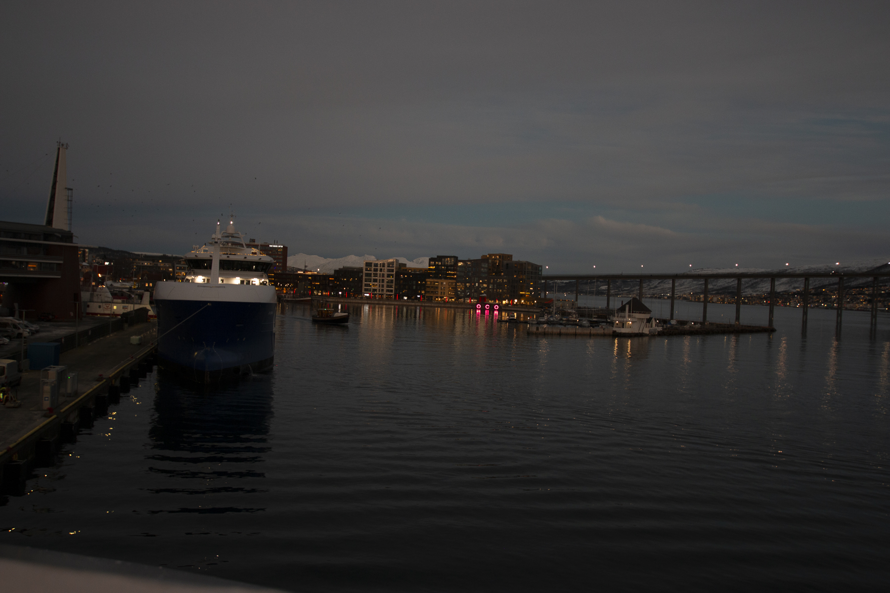 Pünktlich zum Frühstück legten wir in Tromsø, dem Tor zur Arktis, an. Im Blick wieder die Brücke, an deren Ende die Eismeerkathedrale thront. Das Wetter war uns heute besonders gewogen. Kein Schnee, kein Regen und kein Wind. Selbst die Wolken hatten ein Einsehen und ließen etliche Teile des Himmels frei. So wurden wir einer wünderschönen Lichtstimmung ansichtig, wie sie nur in der Polarnacht oder vor einem Sonnenaufgang entsteht und von den Norwegern so geliebt wird.
