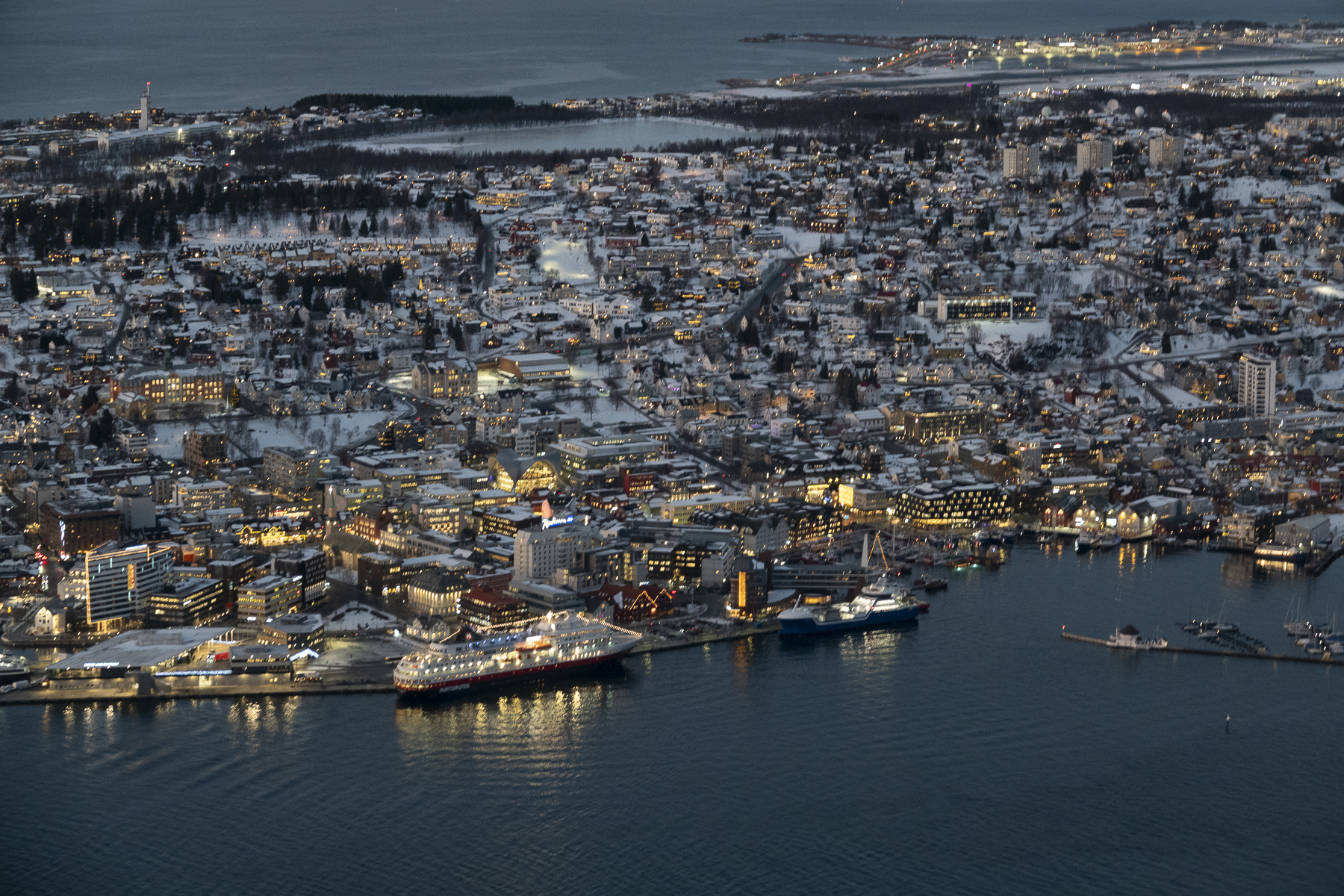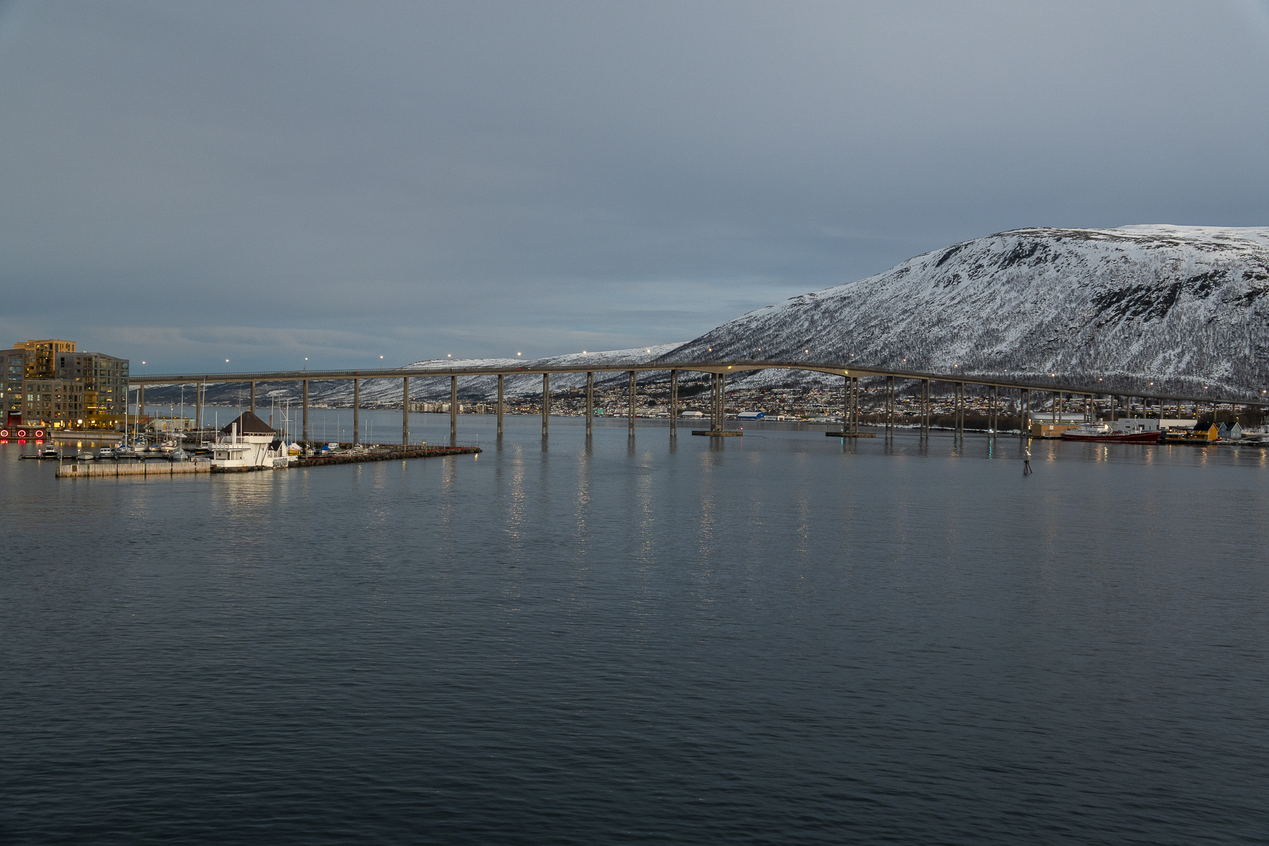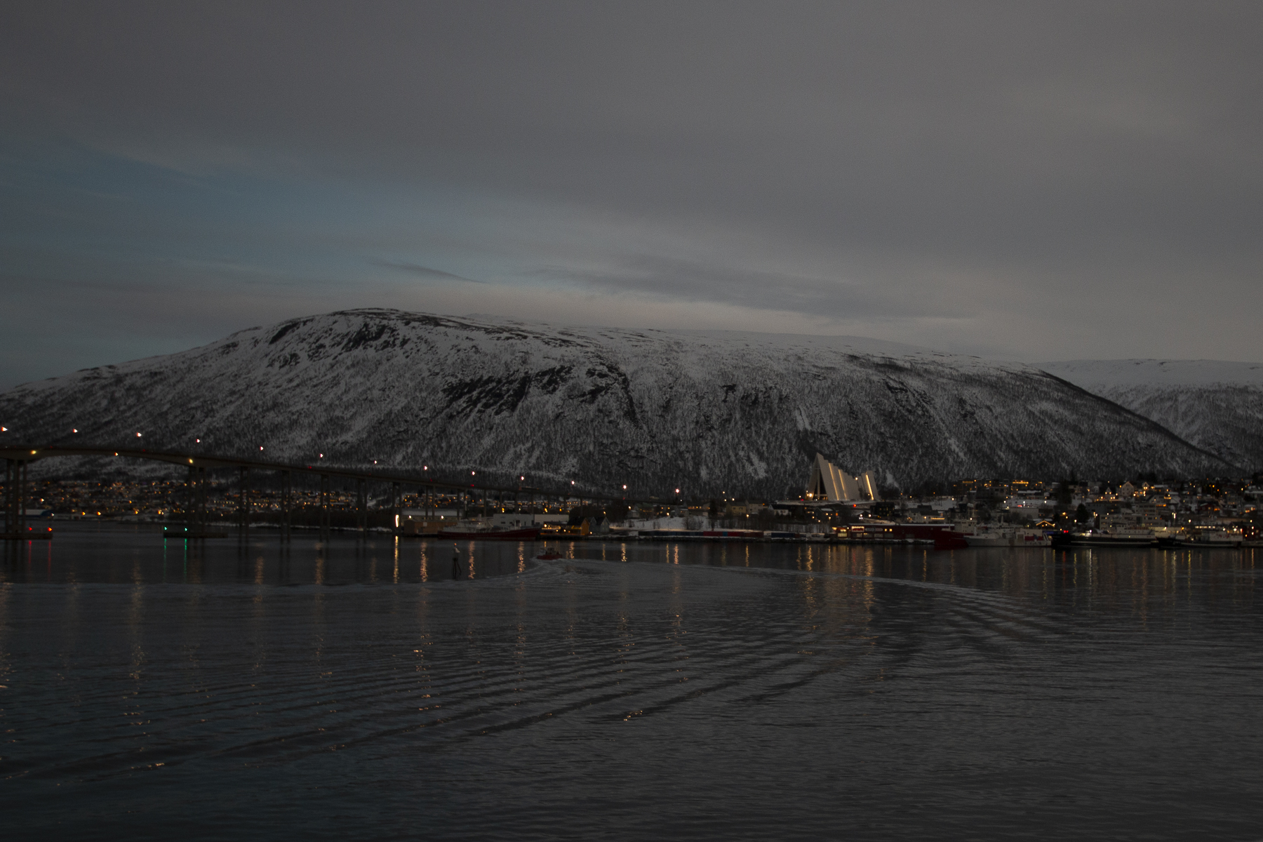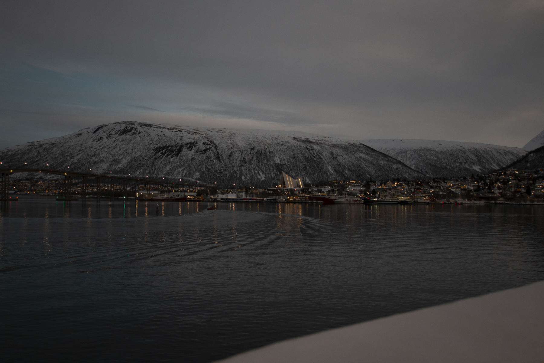 Pünktlich zum Frühstück legten wir in Tromsø, dem Tor zur Arktis, an. Im Blick wieder die Brücke, an deren Ende die Eismeerkathedrale thront. Das Wetter war uns heute besonders gewogen. Kein Schnee, kein Regen und kein Wind. Selbst die Wolken hatten ein Einsehen und ließen etliche Teile des Himmels frei. So wurden wir einer wünderschönen Lichtstimmung ansichtig, wie sie nur in der Polarnacht oder vor einem Sonnenaufgang entsteht und von den Norwegern so geliebt wird.