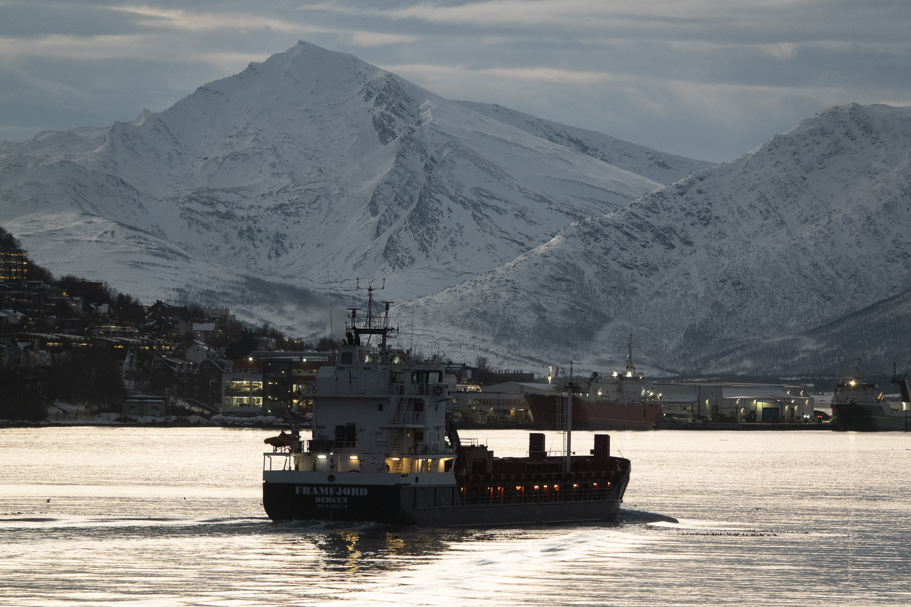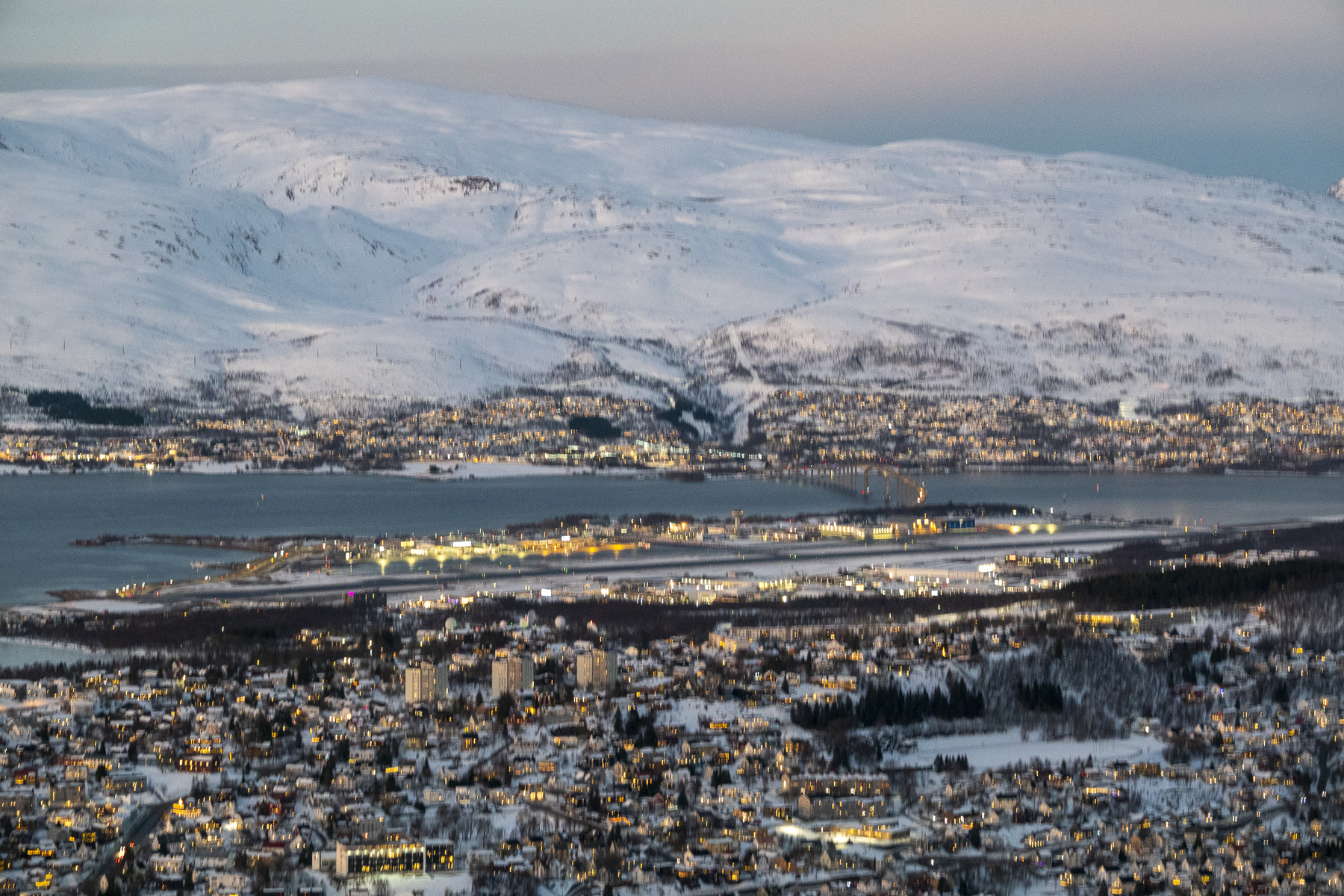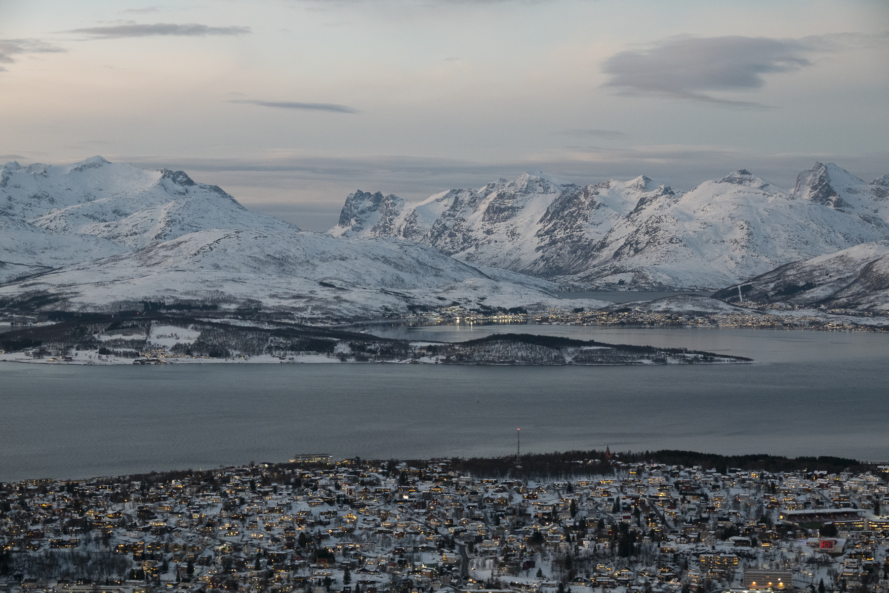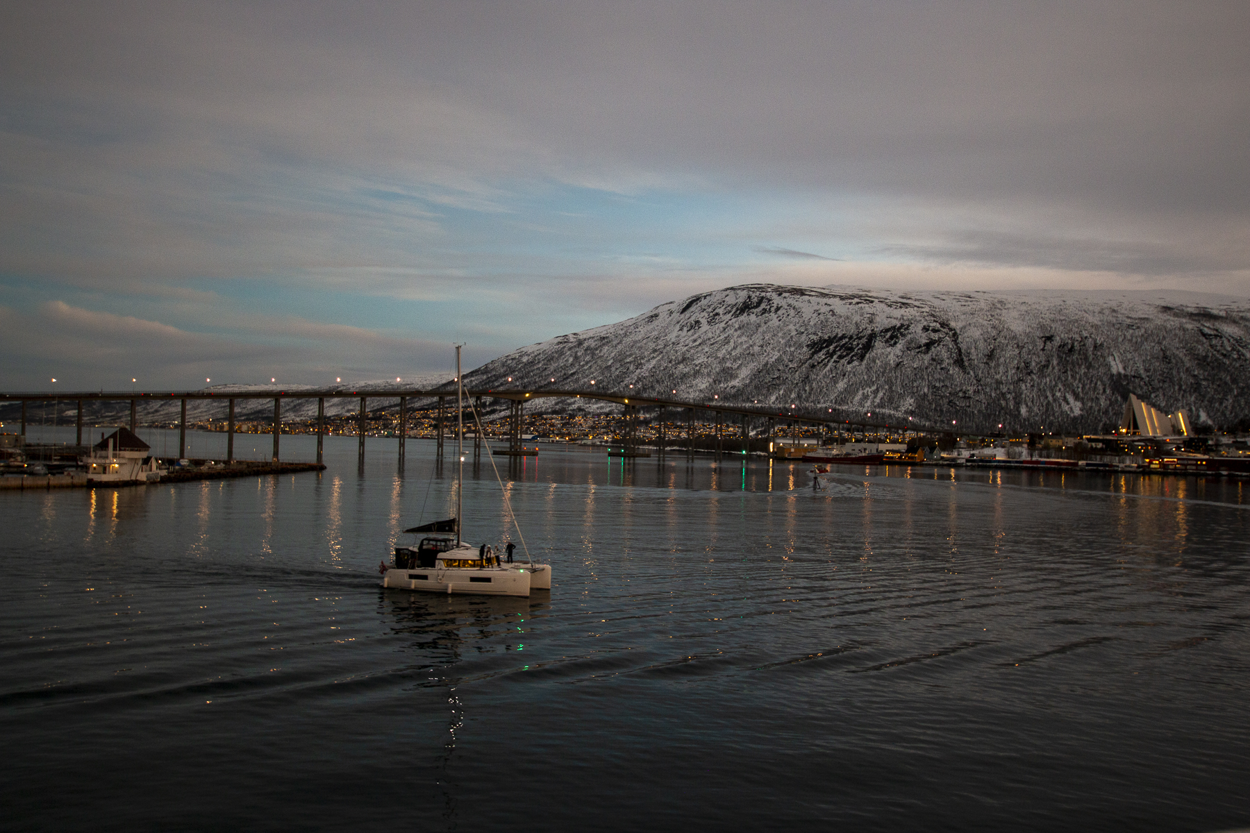 Pünktlich zum Frühstück legten wir in Tromsø, dem Tor zur Arktis, an. Im Blick wieder die Brücke, an deren Ende die Eismeerkathedrale thront. Das Wetter war uns heute besonders gewogen. Kein Schnee, kein Regen und kein Wind. Selbst die Wolken hatten ein Einsehen und ließen etliche Teile des Himmels frei. So wurden wir einer wünderschönen Lichtstimmung ansichtig, wie sie nur in der Polarnacht oder vor einem Sonnenaufgang entsteht und von den Norwegern so geliebt wird.