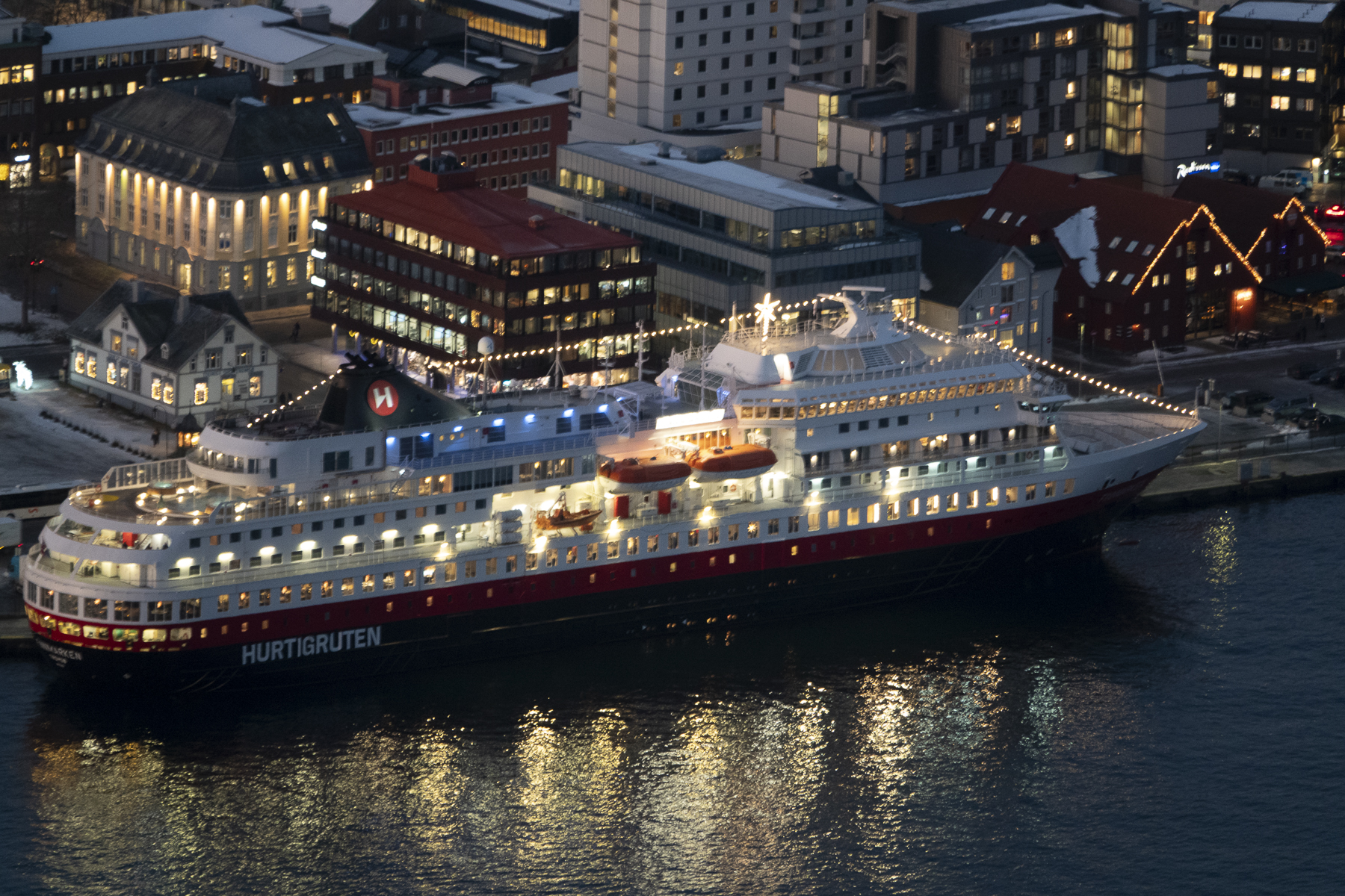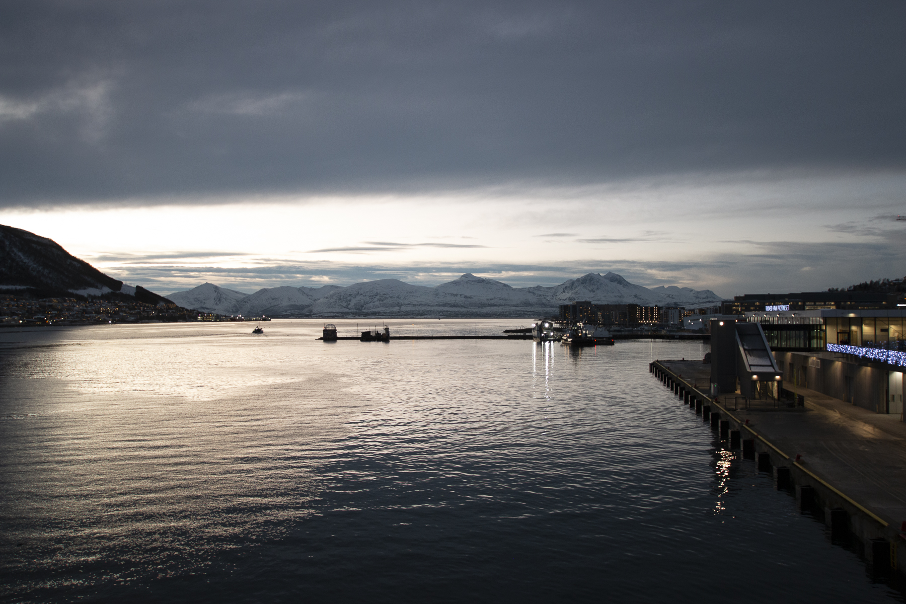 Durch diese ganzen Verzögerungen kamen wir auf der Rückfahrt auch noch in einen Bus-Stau an einem Straßen-Engpass in Tromsø City und schließlich mit über einer Stunde verspätung beim Schiff an. Den geplanten Bummel durch die Einkaufsstraße und über den kleinen Weihnachtsmarkt konnten wir somit vergessen, denn das Schiff wollte in einer knappen Stunde ablegen. Zu wenig Zeit für die City. Dabei hätte ich mir so gern eine Badehose besorgt, denn der Pool vorne im Schiff ist mittlerweile gefüllt. Natürlich habe ich beim Kofferpacken an alles gedacht, nur nicht an die Badehose und die Sportsachen fürs Gym. Ok, letztere hätten auch nicht mehr in den Koffer gepasst.